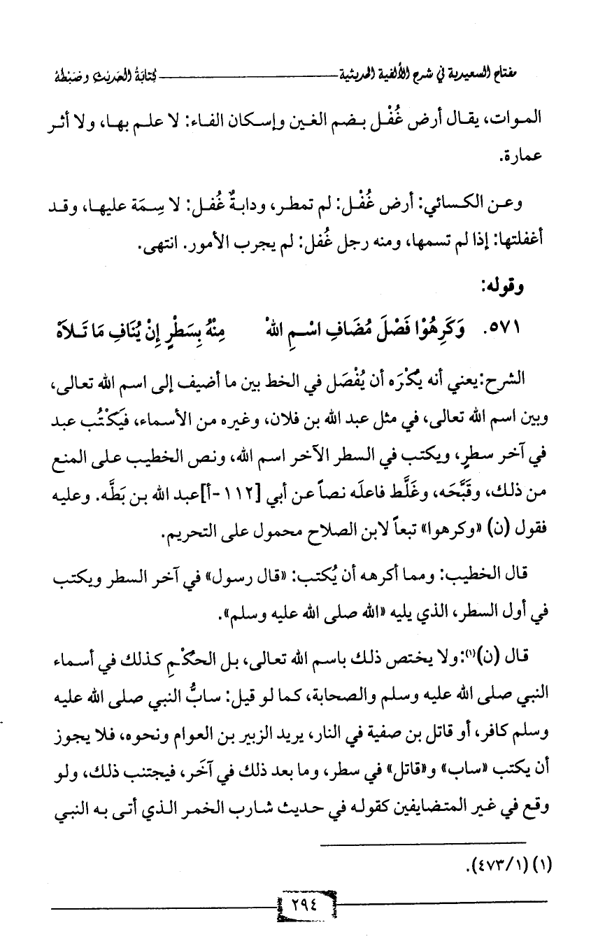 الشرح: يعني أنه يُكْرَه أن يُفْصَل في الخط بين ما أضيف إلى اسم الله تعالى، وبين اسم الله تعالى، في مثل عبد الله بن فلان، وغيره من الأسماء، فَيَكْتُب عبد في آخر سطرٍ، ويكتب في السطر الآخر اسم الله، ونص الخطيب على المنع من ذلك، وقَبَّحَه، وغَلَّط فاعلَه نصاً عن أبي [112 - أ] عبد الله بن بَطَّه. وعليه فقول (ن) «وكرهوا» تبعاً لابن الصلاح محمول على التحريم.