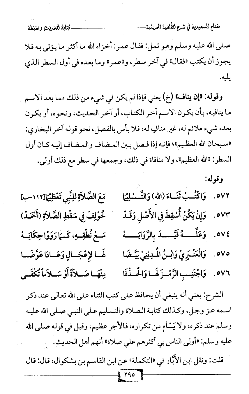 572 - وَاكْتُبْ ثَنَاءَ (اللهِ) وَالتَّسْلِيْمَا ... مَعَ الصَّلاَةِ للِنَّبِي تَعْظِيْمَا [112 - ب]