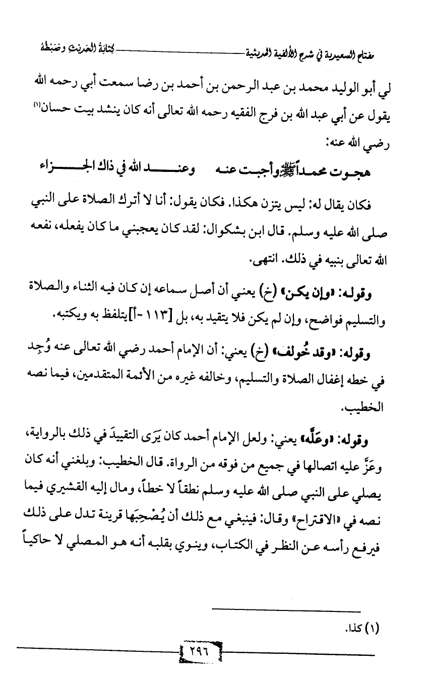 وقوله: «وقد خُولف» (خ) يعني: أن الإمام أحمد رضي الله تعالى عنه وُجِد في خطه إغفال الصلاة والتسليم، وخالفه غيره من الأئمة المتقدمين، فيما نصه الخطيب.