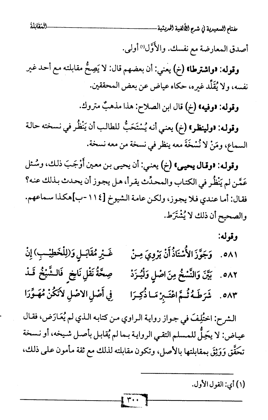 582 - بَيَّنَ وَالنَّسْخُ مِنَ اصْلٍ وَلْيُزَدْ ... صِحَّةُ نَقْلِ نَاسِخٍ فَالشَّيْخُ قَدْ