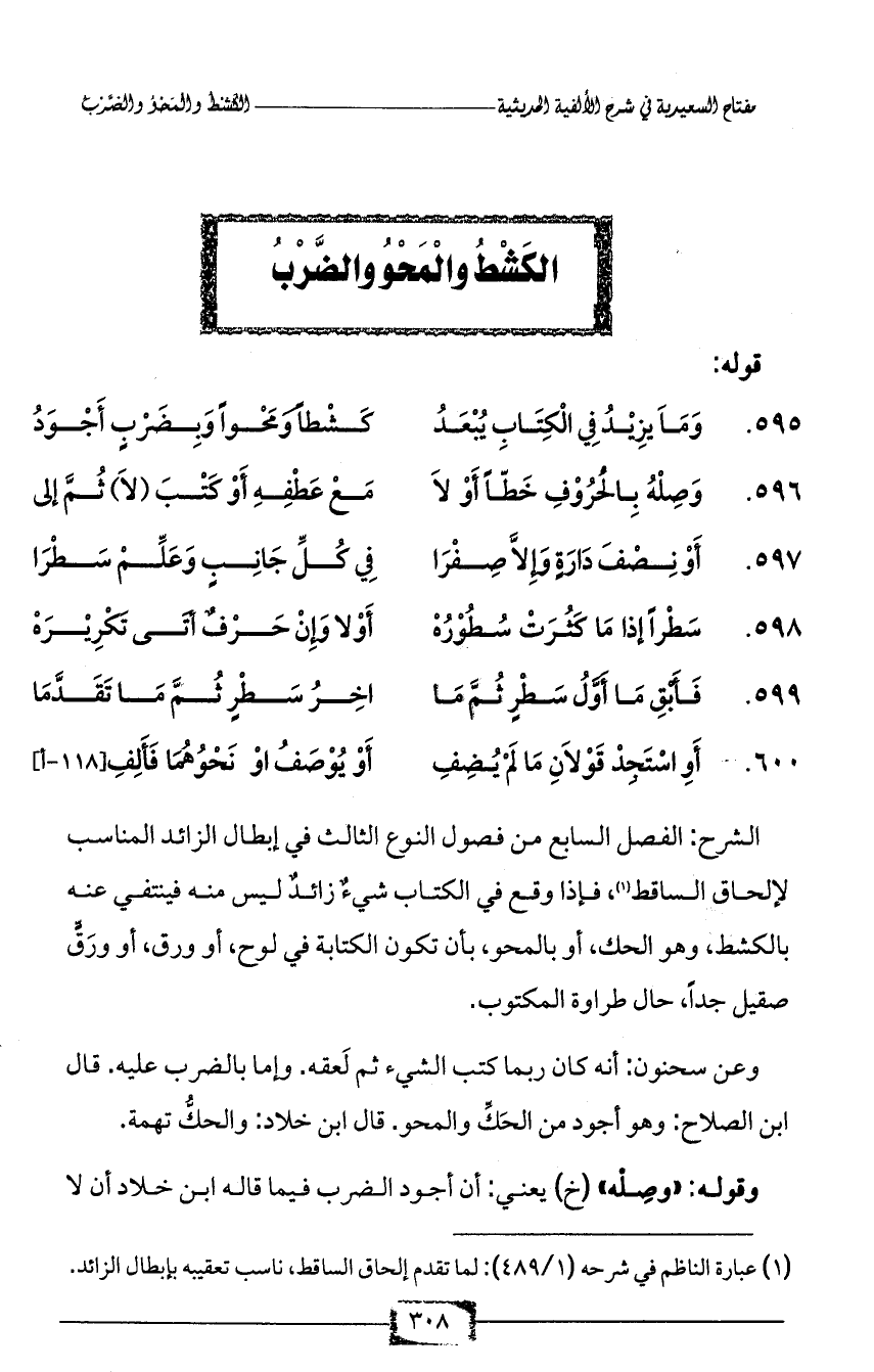 الشرح: الفصل السابع من فصول النوع الثالث في إبطال الزائد المناسب لإلحاق الساقط (¬1)، فإذا وقع في الكتاب شيءٌ زائدٌ ليس منه فينتفي عنه بالكشط، وهو الحك، أو بالمحو، بأن تكون الكتابة في لوح، أو ورق، أو ورَقٍّ صقيل جداً، حال طراوة المكتوب.