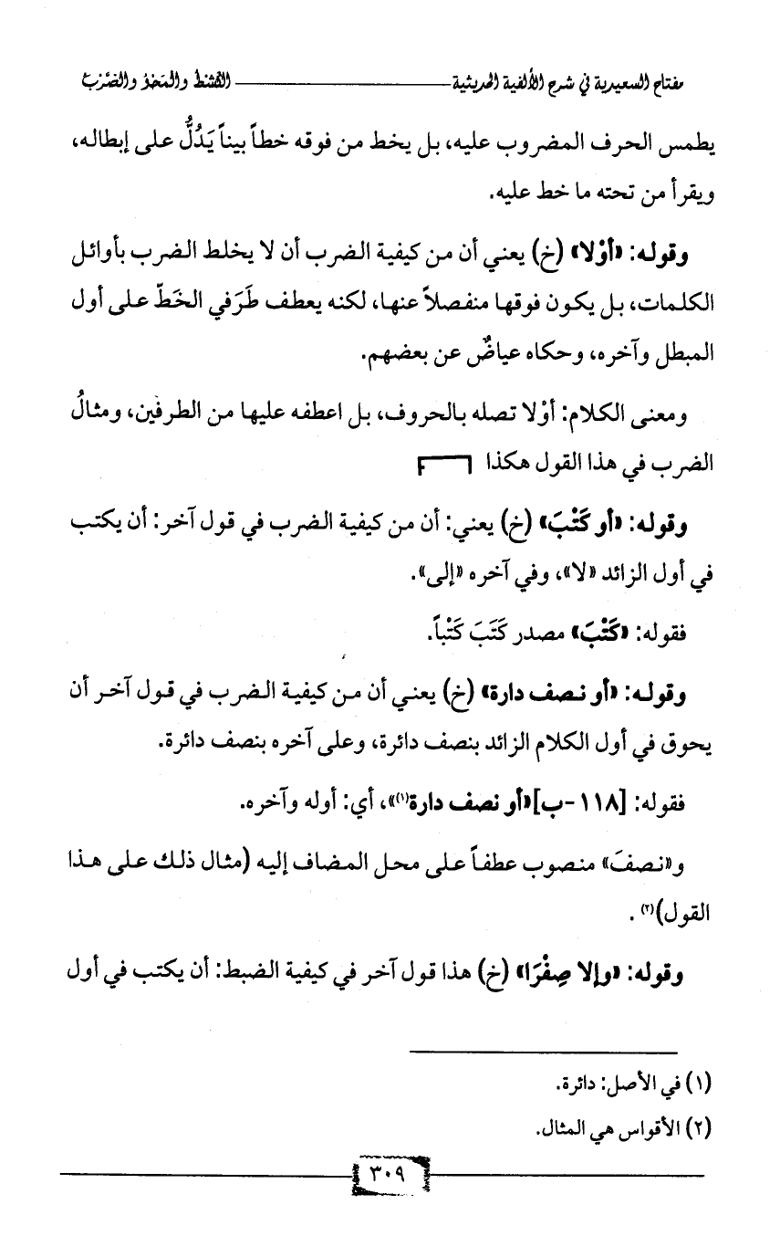 وقوله: «أو نصف دارة» (خ) يعني أن من كيفية الضرب في قول آخر أن يحوق في أول الكلام الزائد بنصف دائرة، وعلى آخره بنصف دائرة.