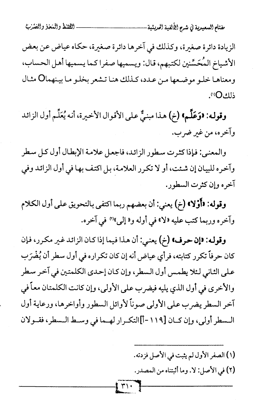 الزيادة دائرة صغيرة، وكذلك في آخرها دائرة صغيرة، حكاه عياض عن بعض الأشياخ المُحَسِّنين لكتبهم، قال: ويسميها صفرا كما يسميها أهل الحساب، ومعناها خلو موضعها من عدد، كذلك هنا تشعر بخلو ما بينهما O مثال ذلك O (¬1) .