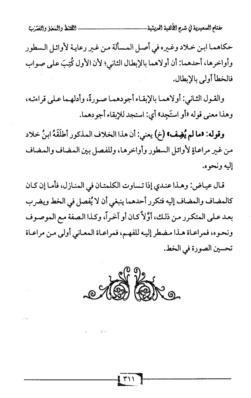 قال عياض: وهذا عندي إذا تساوت الكلمتان في المنازل، فأما إن كان كالمضاف والمضاف إليه فتكرر أحدهما ينبغي أن لا يُفصل في الخط ويضرب بعد على المتكرر من ذلك، أوَّلاً كان أو آخراً، وكذا الصفة مع الموصوف ونحوه، فمراعاة هذا مضطر إليه للفهم، فمراعاة المعاني أولى من مراعاة تحسين الصورة في الخط.