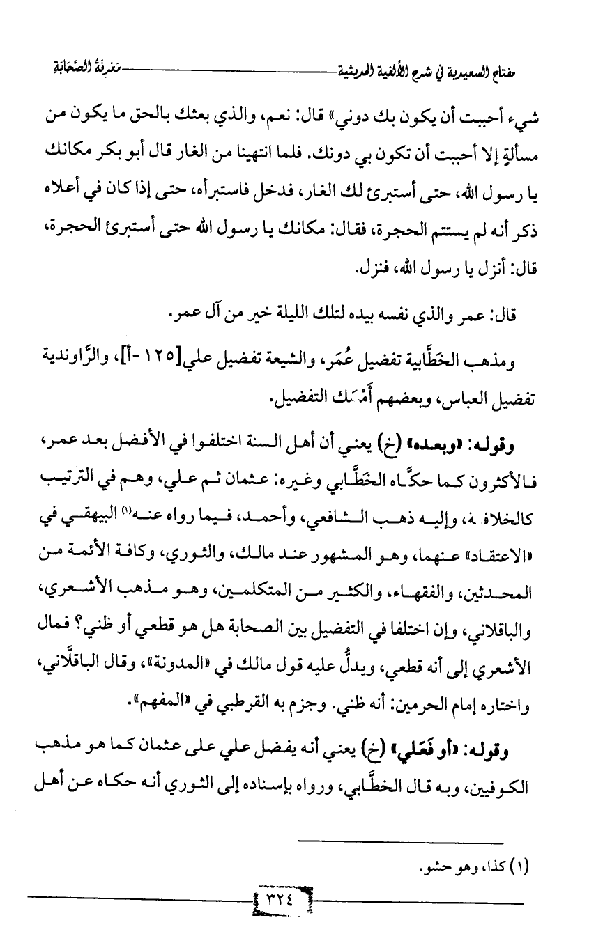 ومذهب الخَطَّابية تفضيل عُمَر، والشيعة تفضيل علي [125 - أ]، والرَّاوندية تفضيل العباس، وبعضهم أَمْسَك التفضيل.