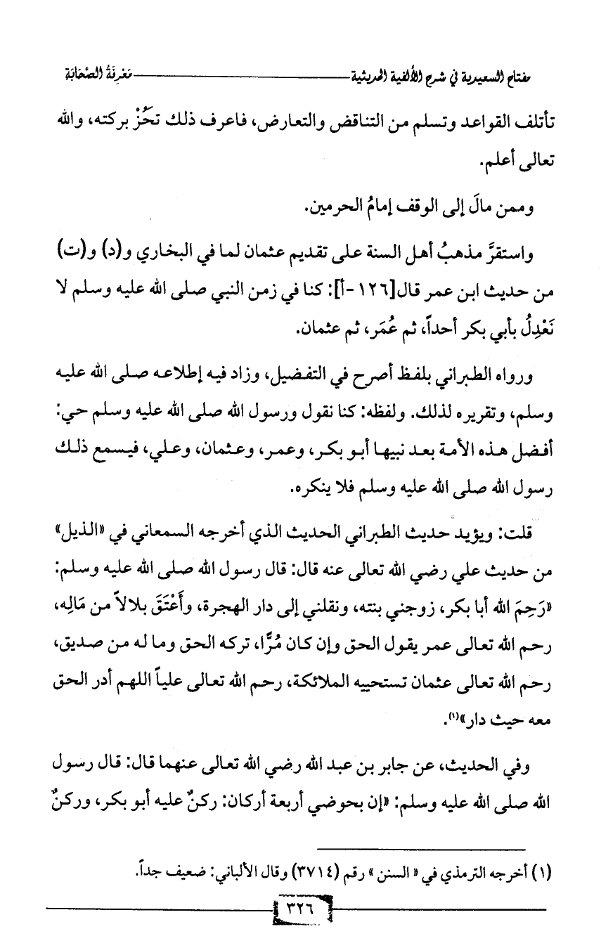 واستقرَّ مذهبُ أهل السنة على تقديم عثمان لما في البخاري و (د) و (ت) من حديث ابن عمر قال [126 - أ]: كنا في زمن النبي صلى الله عليه وسلم لا نَعْدِلُ بأبي بكر أحداً، ثم عُمَر، ثم عثمان.