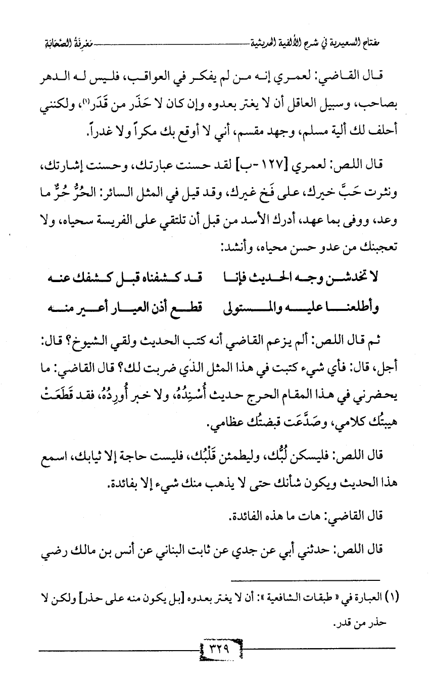 قال اللص: لعمري [127 - ب] لقد حسنت عبارتك، وحسنت إشارتك، ونثرت حَبَّ خيرك، على فَخ غيرك، وقد قيل في المثل السائر: الحُرُّ حُرٌّ ما وعد، ووفى بما عهد، أدرك الأسد من قبل أن تلتقي على الفريسة سحياه، ولا تعجبنك من عدو حسن محياه، وأنشد:
