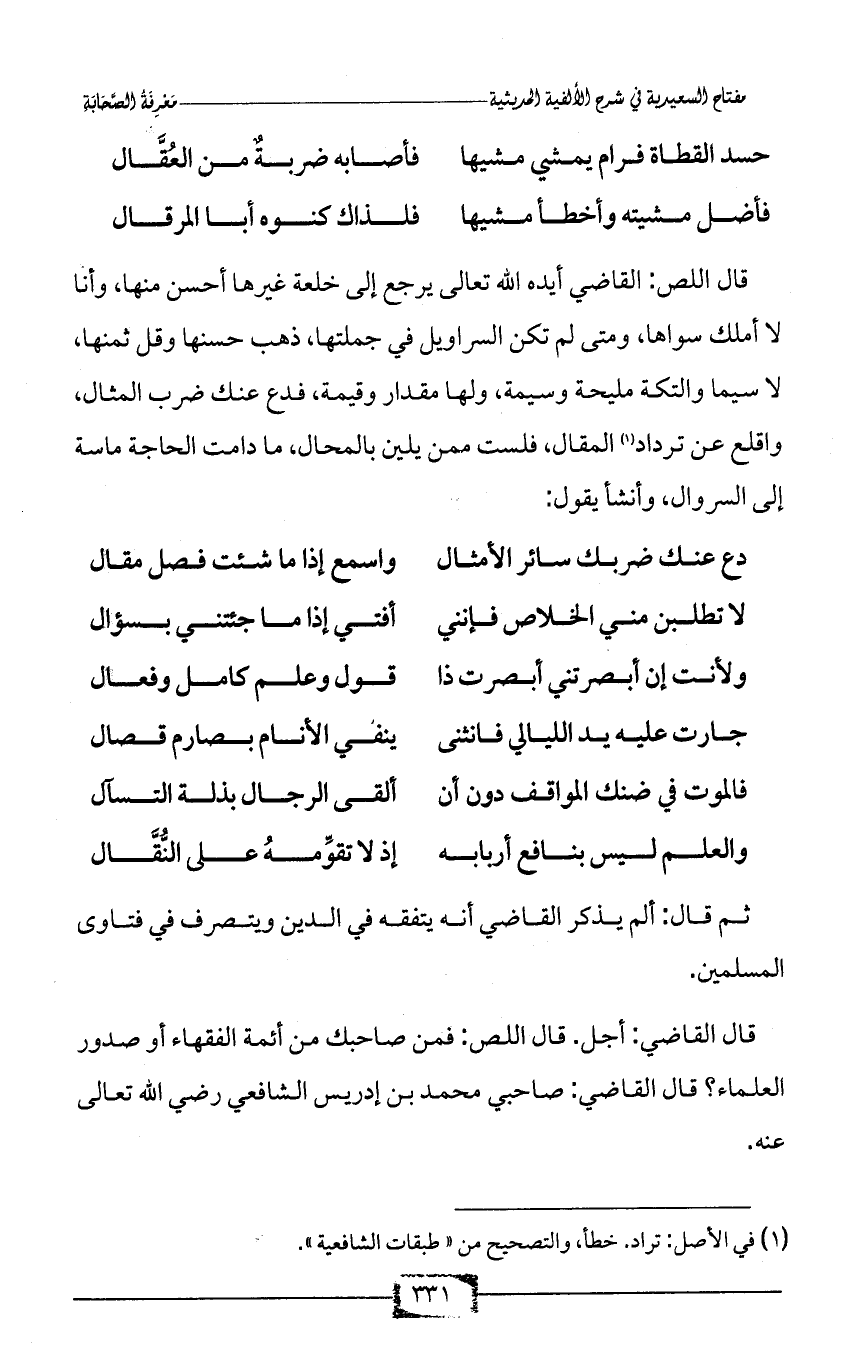 قال اللص: القاضي أيده الله تعالى يرجع إلى خلعة غيرها أحسن منها، وأنا لا أملك سواها، ومتى لم تكن السراويل في جملتها، ذهب حسنها وقل ثمنها، لا سيما والتكة مليحة وسيمة، ولها مقدار وقيمة، فدع عنك ضرب المثال، واقلع عن ترداد (¬1) المقال، فلست ممن يلين بالمحال، ما دامت الحاجة ماسة إلى السروال، وأنشأ يقول: