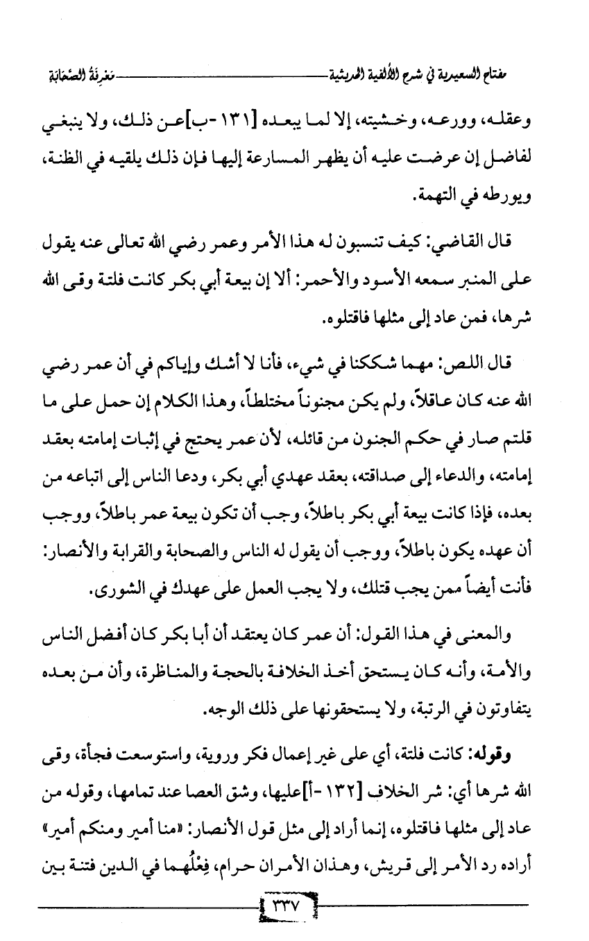 وقوله: كانت فلتة، أي على غير إعمال فكر وروية، واستوسعت فجأة، وقى الله شرها أي: شر الخلاف [132 - أ] عليها، وشق العصا عند تمامها، وقوله من عاد إلى مثلها فاقتلوه، إنما أراد إلى مثل قول الأنصار: «منا أمير ومنكم أمير» أراده رد الأمر إلى قريش، وهذان الأمران حرام، فِعْلُهما في الدين فتنة بين