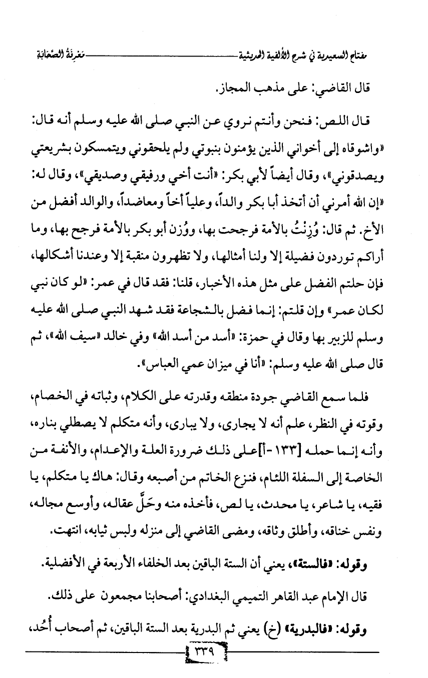 قال اللص: فنحن وأنتم نروي عن النبي صلى الله عليه وسلم أنه قال: «واشوقاه إلى أخواني الذين يؤمنون بنبوتي ولم يلحقوني ويتمسكون بشريعتي ويصدقوني»، وقال أيضاً لأبي بكر: «أنت أخي ورفيقي وصديقي»، وقال له: «إن الله أمرني أن أتخذ أبا بكر والداً، وعلياً أخاً ومعاضداً، والوالد أفضل من الأخ. ثم قال: وُزِنْتُ بالأمة فرجحت بها، ووُزن أبو بكر بالأمة فرجح بها، وما أراكم توردون فضيلة إلا ولنا أمثالها، ولا تظهرون منقبة إلا وعندنا أشكالها، فإن حلتم الفضل على مثل هذه الأخبار، قلنا: فقد قال في عمر: «لو كان نبي لكان عمر» وإن قلتم: إنما فضل بالشجاعة فقد شهد النبي صلى الله عليه وسلم للزبير بها وقال في حمزة: «أسد من أسد الله» وفي خالد «سيف الله»، ثم قال صلى الله عليه وسلم: «أنا في ميزان عمي العباس».