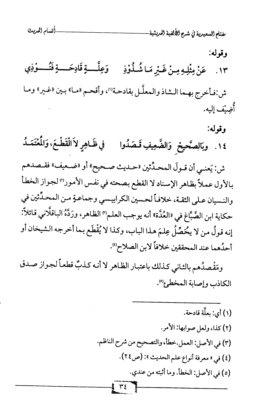 ش: يَعني أن قولَ المحدِّثين «حديث صحيح» أو «ضعيف» فقصدهم بالأول عملاً بظاهر الإسناد لا القطع بصحته في نفس الأمور (¬2) لجواز الخطأ والنسيان على الثقة، خلافاً لحسين الكرابيسي وجماعةٍ من المحدِّثين في حكاية ابن الصَّبَّاغ في «العُدَّة» أنه يوجب العلم (¬3) الظاهر، ورَدَّهُ الباقلَّاني قائلاً: إنه قولُ من لا يُحَصِّلُ عِلمَ هذا الباب، وكذا لا يُقْطَع بما أخرجه الشيخان أو أحدُهما عند المحققين خلافاً لابن الصلاح (¬4).