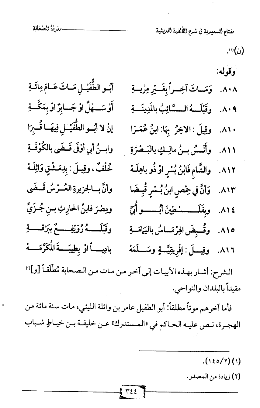الشرح: أشار بهذه الأبيات إلى آخر من مات من الصحابة مُطْلَقاً [و] (¬2) مقيداً بالبلدان والنواحي.