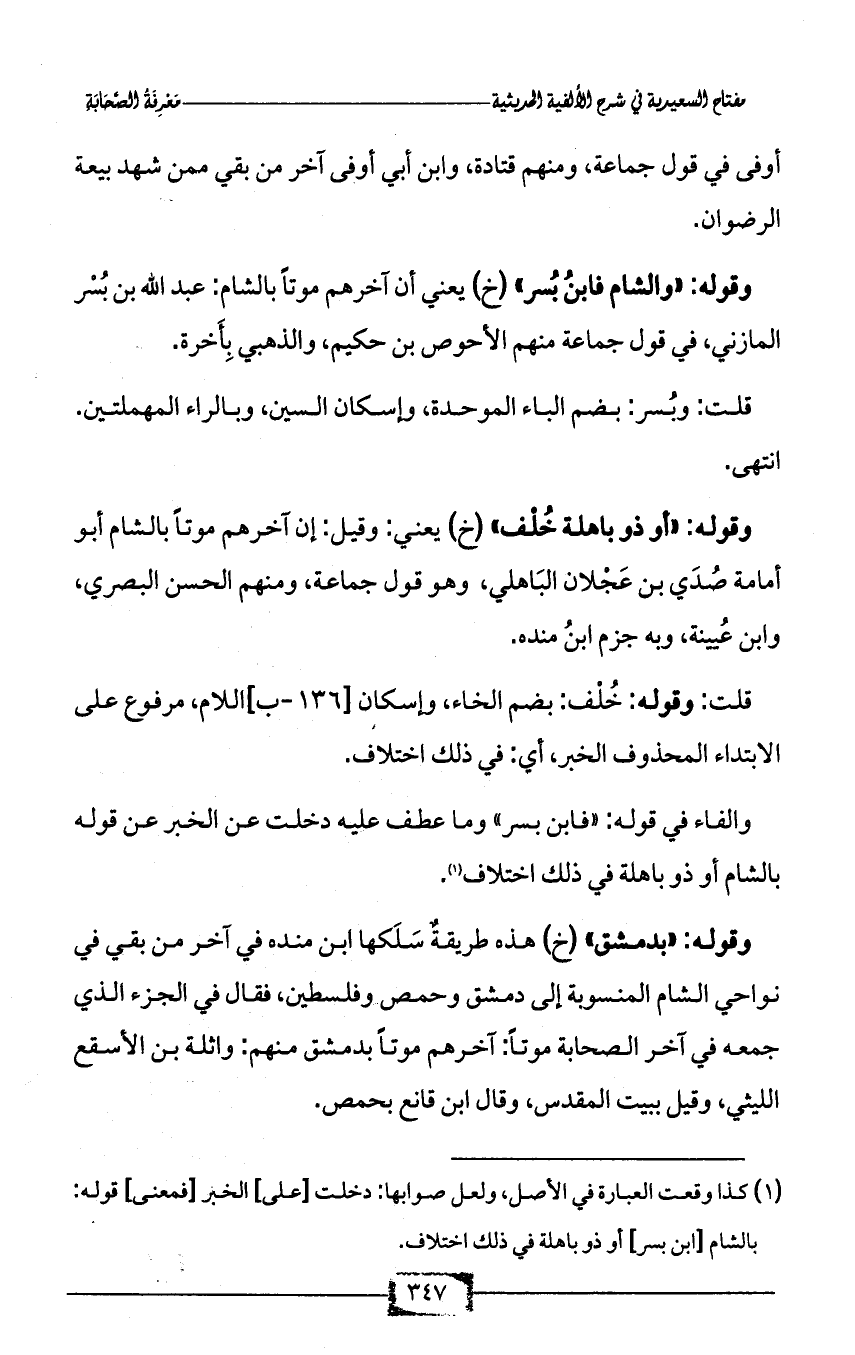 وقوله: «والشام فابنُ بُسر» (خ) يعني أن آخرهم موتاً بالشام: عبد الله بن بُسْر المازني، في قول جماعة منهم الأحوص بن حكيم، والذهبي بِأَخرة.