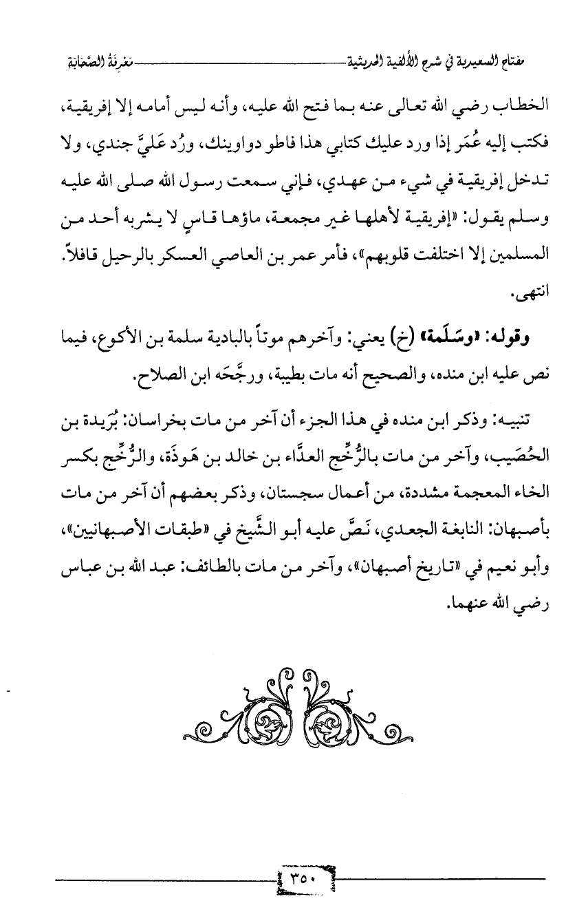الخطاب رضي الله تعالى عنه بما فتح الله عليه، وأنه ليس أمامه إلا إفريقية، فكتب إليه عُمَر إذا ورد عليك كتابي هذا فاطو دواوينك، ورُد عَليَّ جندي، ولا تدخل إفريقية في شيء من عهدي، فإني سمعت رسول الله صلى الله عليه وسلم يقول: «إفريقية لأهلها غير مجمعة، ماؤها قاسٍ لا يشربه أحد من المسلمين إلا اختلفت قلوبهم»، فأمر عمر بن العاصي العسكر بالرحيل قافلاً. انتهى.
