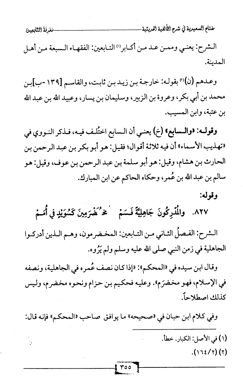 الشرح: الفصلُ الثاني من التابعين: المخضرمون، وهم الذين أدركوا الجاهلية في زمن النبي صلى الله عليه وسلم ولم يَرُوه.