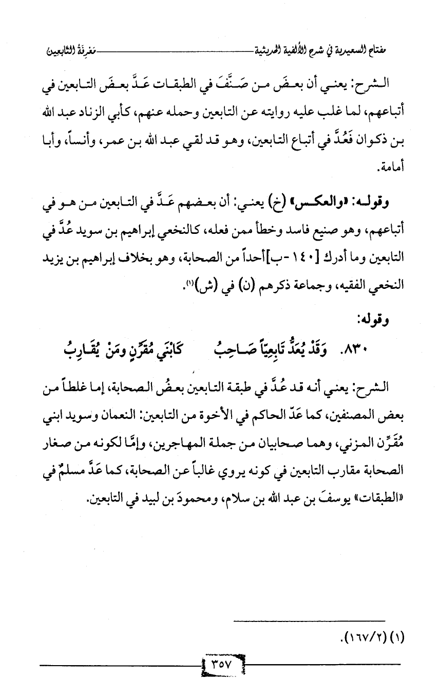 830 - وَقَدْ يُعَدُّ تَابِعِيّاً صَاحِبُ ... كَابْنَي مُقَرِّنٍ ومَنْ يُقَارِبُ