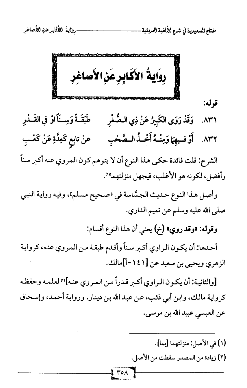 أحدها: أن يكون الراوي أكبر سناً وأقدم طبقة من المروي عنه، كرواية الزهري ويحيى بن سعيد عن [141 - أ] مالك.