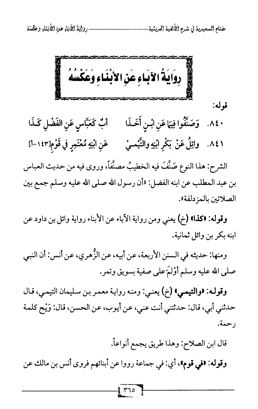 الشرح: هذا النوع صَنَّفَ فيه الخطيبُ مصنَّفاً، وروى فيه من حديث العباس بن عبد المطلب عن ابنه الفضل: «أن رسول الله صلى الله عليه وسلم جمع بين الصلاتين بالمزدلفة».