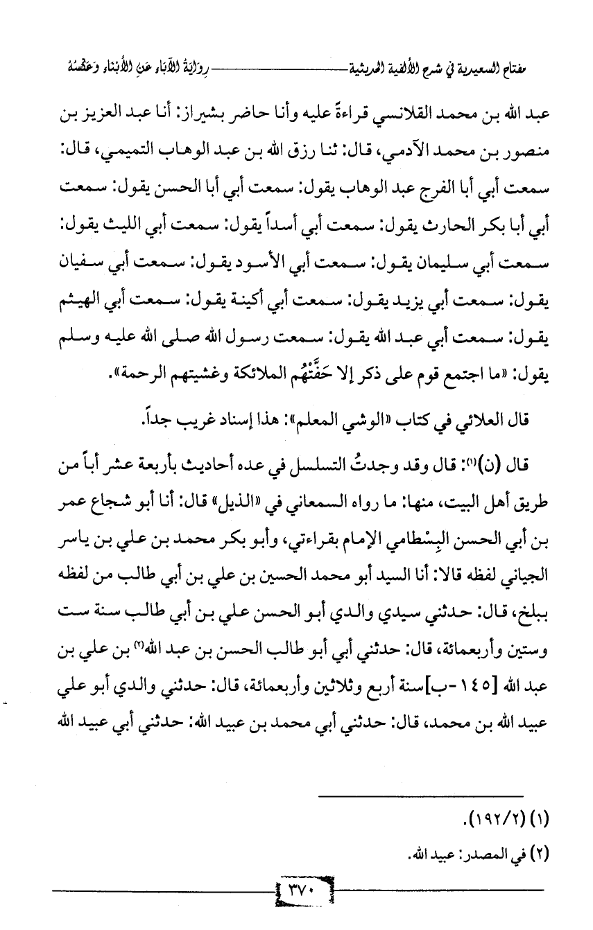 قال (ن) (¬1): قال وقد وجدتُ التسلسل في عده أحاديث بأربعة عشر أباً من طريق أهل البيت، منها: ما رواه السمعاني في «الذيل» قال: أنا أبو شجاع عمر بن أبي الحسن البِسْطامي الإمام بقراءتي، وأبو بكر محمد بن علي بن ياسر الجياني لفظه قالا: أنا السيد أبو محمد الحسين بن علي بن أبي طالب من لفظه ببلخ، قال: حدثني سيدي والدي أبو الحسن علي بن أبي طالب سنة ست وستين وأربعمائة، قال: حدثني أبي أبو طالب الحسن بن عبد الله (¬2) بن علي بن عبد الله [145 - ب] سنة أربع وثلاثين وأربعمائة، قال: حدثني والدي أبو علي عبيد الله بن محمد، قال: حدثني أبي محمد بن عبيد الله: حدثني أبي عبيد الله