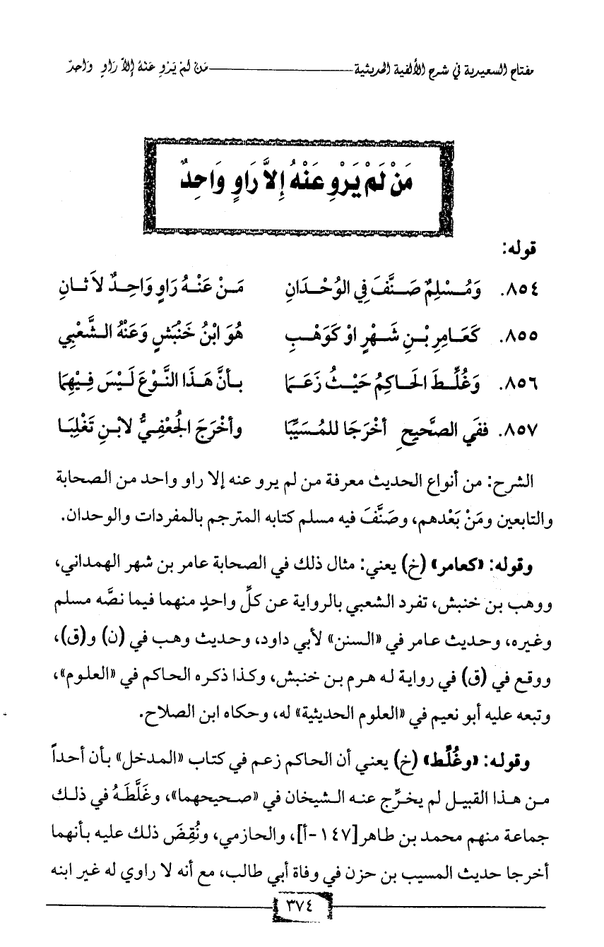 الشرح: من أنواع الحديث معرفة من لم يرو عنه إلا راو واحد من الصحابة والتابعين ومَنْ بَعْدهم، وصَنَّفَ فيه مسلم كتابه المترجم بالمفردات والوحدان.