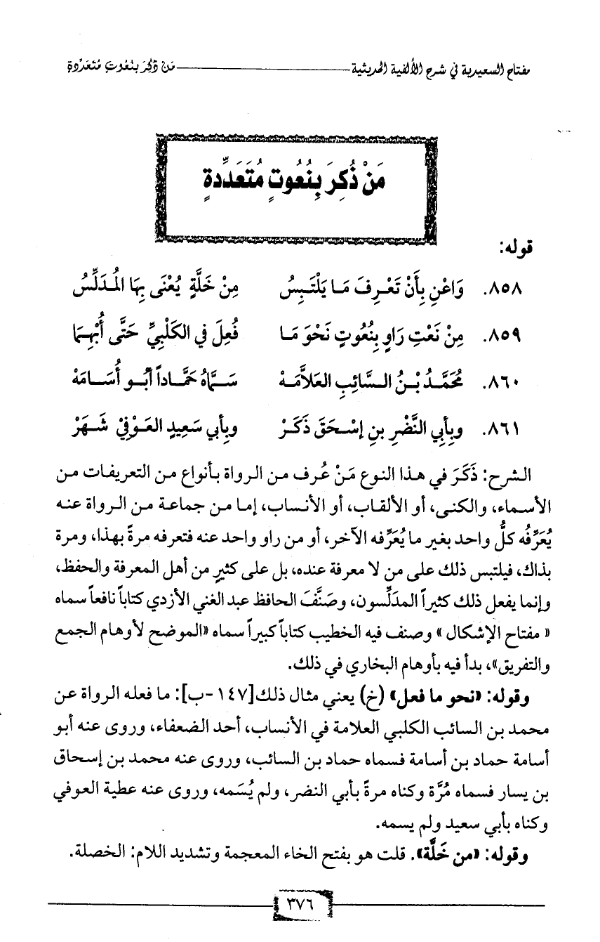 الشرح: ذَكَرَ في هذا النوع مَنْ عُرف من الرواة بأنواع من التعريفات من الأسماء، والكنى، أو الألقاب، أو الأنساب، إما من جماعة من الرواة عنه يُعَرِّفُه كلُّ واحد بغير ما يُعَرِّفه الآخر، أو من راو واحد عنه فتعرفه مرةً بهذا، ومرة بذاك، فيلتبس ذلك على من لا معرفة عنده، بل على كثيرٍ من أهل المعرفة والحفظ، وإنما يفعل ذلك كثيراً المدَلِّسون، وصَنَّفَ الحافظ عبد الغني الأزدي كتاباً نافعاً سماه «مفتاح الإشكال» وصنف فيه الخطيب كتاباً كبيراً سماه «الموضح لأوهام الجمع والتفريق»، بدأ فيه بأوهام البخاري في ذلك.