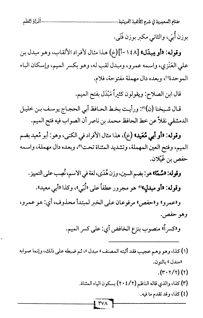وقوله: «أو مِبدَل» [148 - أ] (خ) هذا مثال لأفراد الألقاب، وهو مبدل بن علي العَنَزي، واسمه عمرو، ومبدل لقب له، وهو بكسر الميم، وإسكان الباء الموحدة (¬1)، وبعده دال مهملة مفتوحة، فلام.