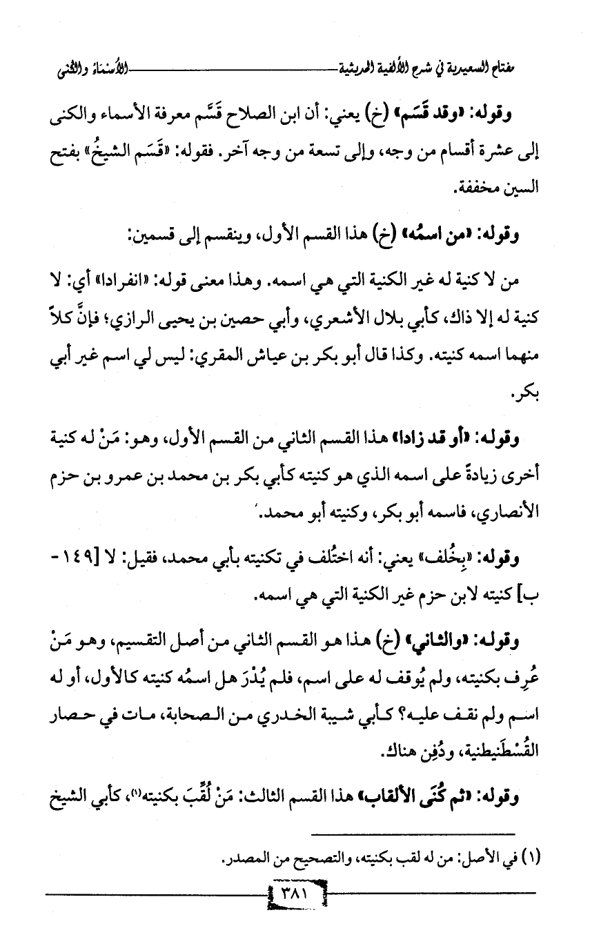 وقوله: «وقد قَسَم» (خ) يعني: أن ابن الصلاح قَسَّم معرفة الأسماء والكنى إلى عشرة أقسام من وجه، وإلى تسعة من وجه آخر. فقوله: «قَسَم الشيخُ» بفتح السين مخففة.