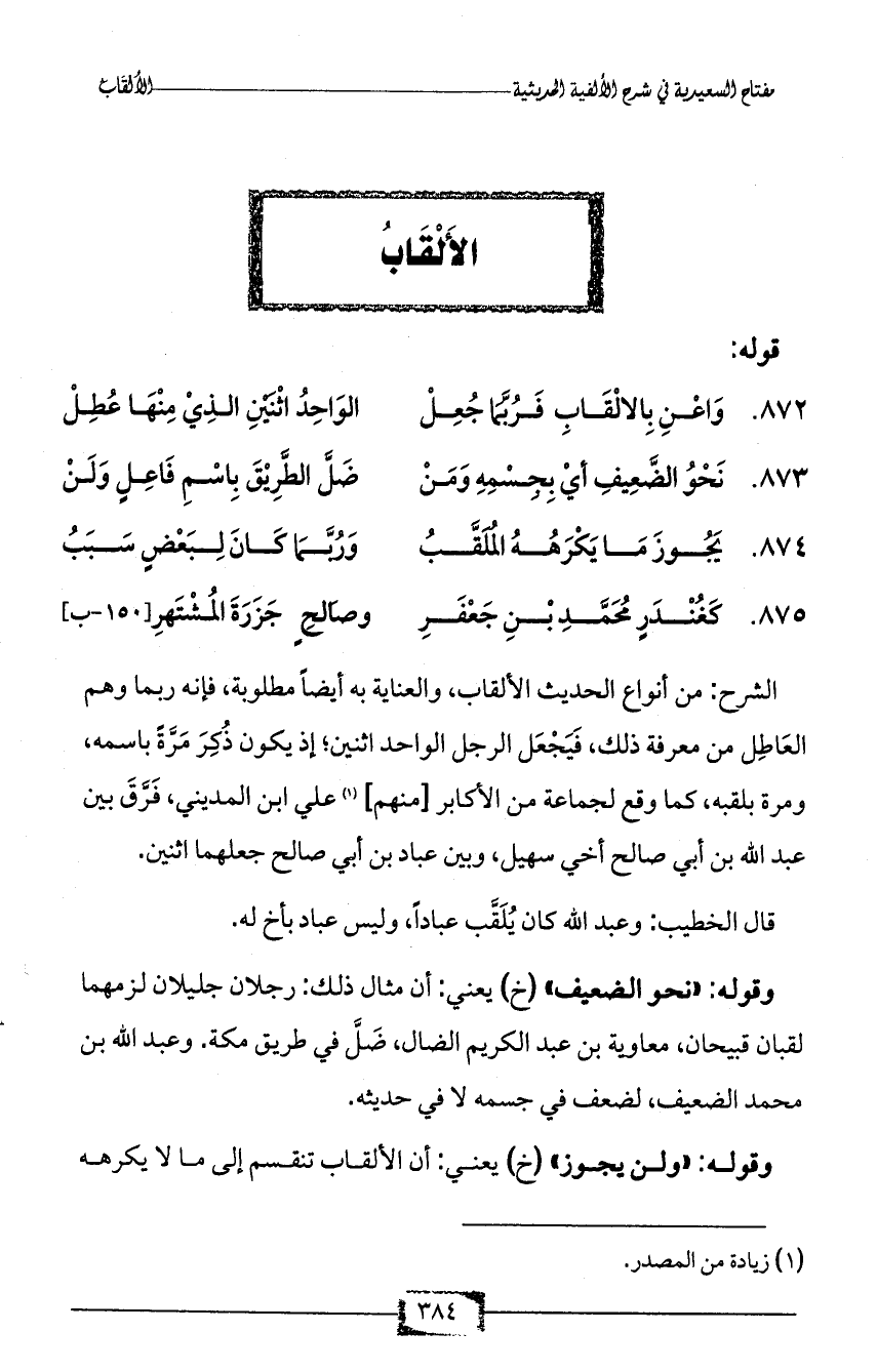 الشرح: من أنواع الحديث الألقاب، والعناية به أيضاً مطلوبة، فإنه ربما وهم العَاطِل من معرفة ذلك، فَيَجْعَل الرجل الواحد اثنين؛ إذ يكون ذُكِرَ مَرَّةً باسمه، ومرة بلقبه، كما وقع لجماعة من الأكابر [منهم] (¬1) علي ابن المديني، فَرَّقَ بين عبد الله بن أبي صالح أخي سهيل، وبين عباد بن أبي صالح جعلهما اثنين.
