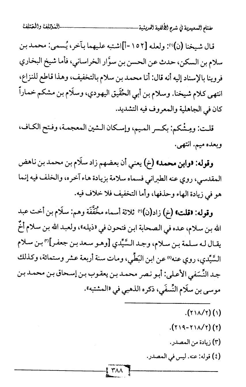 وقوله: «وابن محمد» (خ) يعني أن بعضهم زاد سلَام بن محمد بن ناهض المقدسي، روي عنه الطبراني فسماه سلامة بزيادة هاء آخره، والخلف فيه إنما هو في زيادة الهاء وحذفها، وأما التخفيف فلا خلاف فيه.