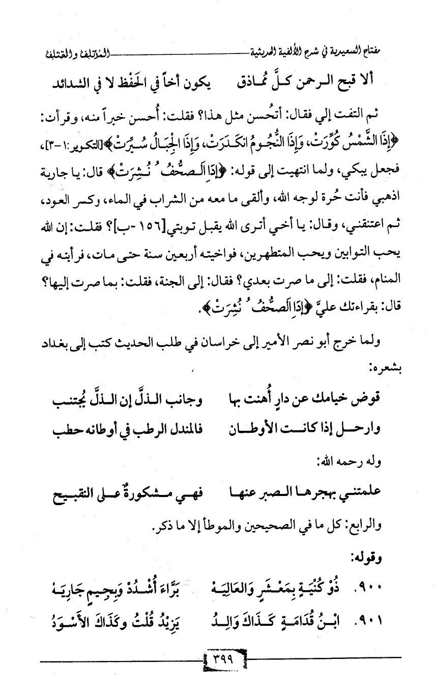 900 - ذُوْ كُنْيَةٍ بِمَعْشَرٍ وَالعَالِيَهْ ... بَرَّاءَ أُشْدُدْ وَبِجِيمٍ جَارِيَهْ