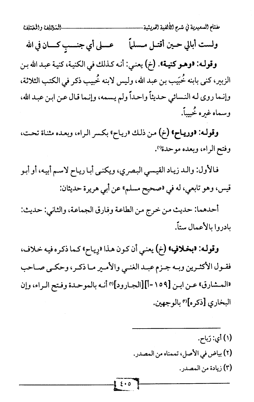 وقوله: «بخلافٍ» (خ) يعني أن كون هذا «رِياح» كما ذكره فيه خلاف، فقول الأكثرين وبه جزم عبد الغني والأمير ما ذكر، وحكى صاحب «المشارق» عن ابن [159 - أ] [الجارود] (¬2) أنه بالموحدة وفتح الراء، وإن البخاري [ذكره] (¬3) بالوجهين.