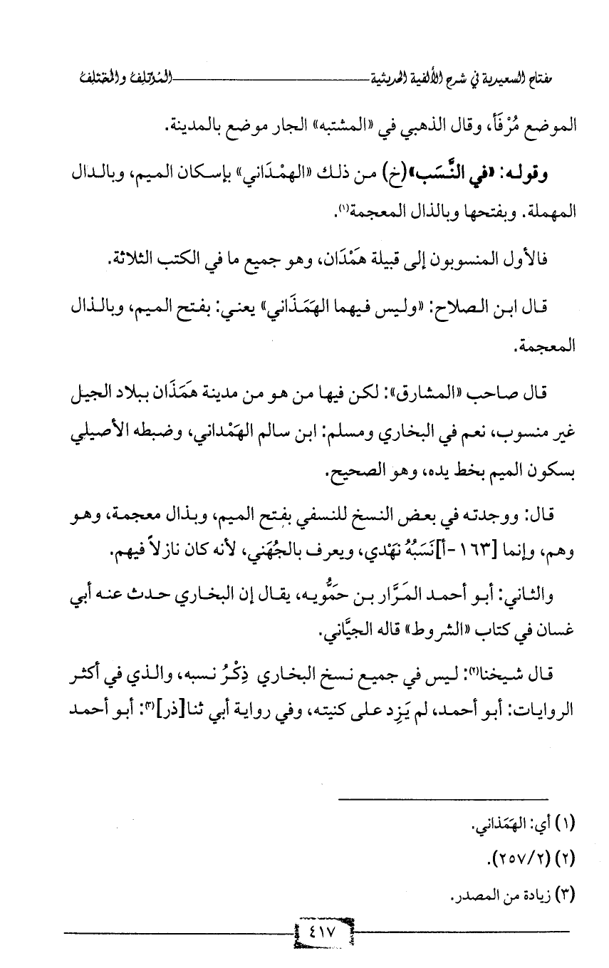 قال صاحب «المشارق»: لكن فيها من هو من مدينة هَمَذَان ببلاد الجيل غير منسوب، نعم في البخاري ومسلم: ابن سالم الهَمْداني، وضبطه الأصيلي بسكون الميم بخط يده، وهو الصحيح.
