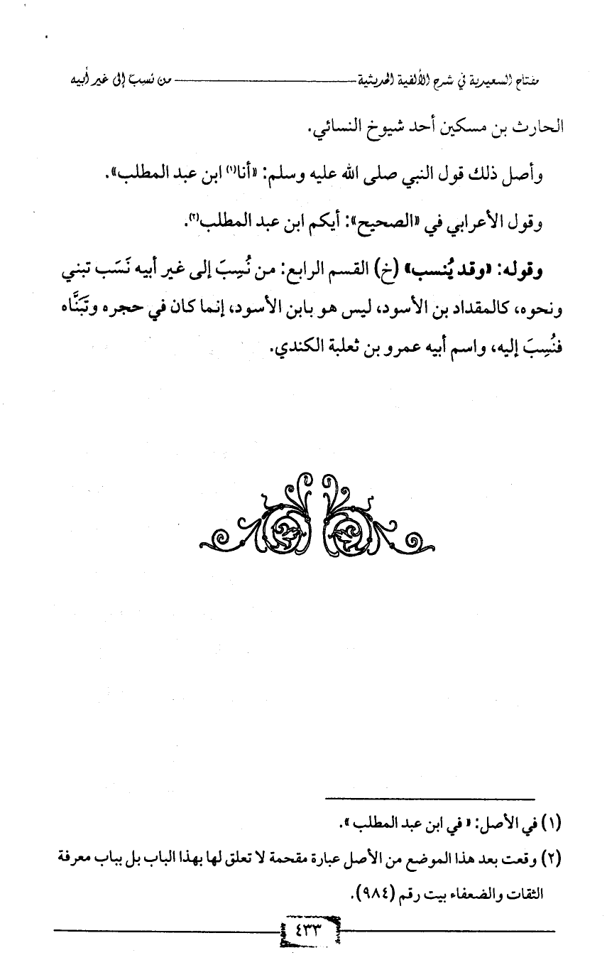 وقوله: «وقد يُنسب» (خ) القسم الرابع: من نُسِبَ إلى غير أبيه نَسَب تبني ونحوه، كالمقداد بن الأسود، ليس هو بابن الأسود، إنما كان في حجره وتَبَنَّاه فنُسِبَ إليه، واسم أبيه عمرو بن ثعلبة الكندي.