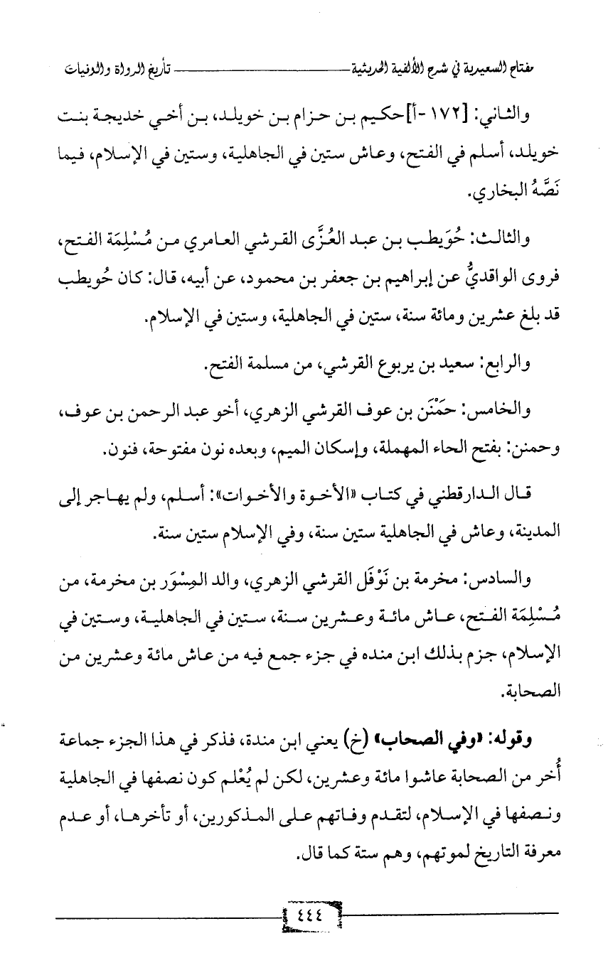 وقوله: «وفي الصحاب» (خ) يعني ابن مندة، فذكر في هذا الجزء جماعة أُخر من الصحابة عاشوا مائة وعشرين، لكن لم يُعْلم كون نصفها في الجاهلية ونصفها في الإسلام، لتقدم وفاتهم على المذكورين، أو تأخرها، أو عدم معرفة التاريخ لموتهم، وهم ستة كما قال.
