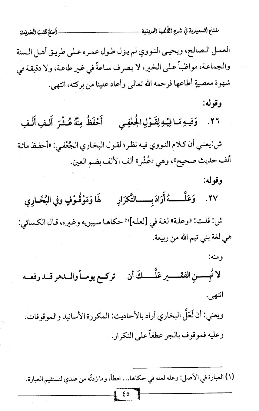 26 - وَفيهِ مَا فِيْهِ لِقَوْلِ الجُعْفِي ... أَحْفَظُ مِنْهُ عُشْرَ أَلفِ أَلْف