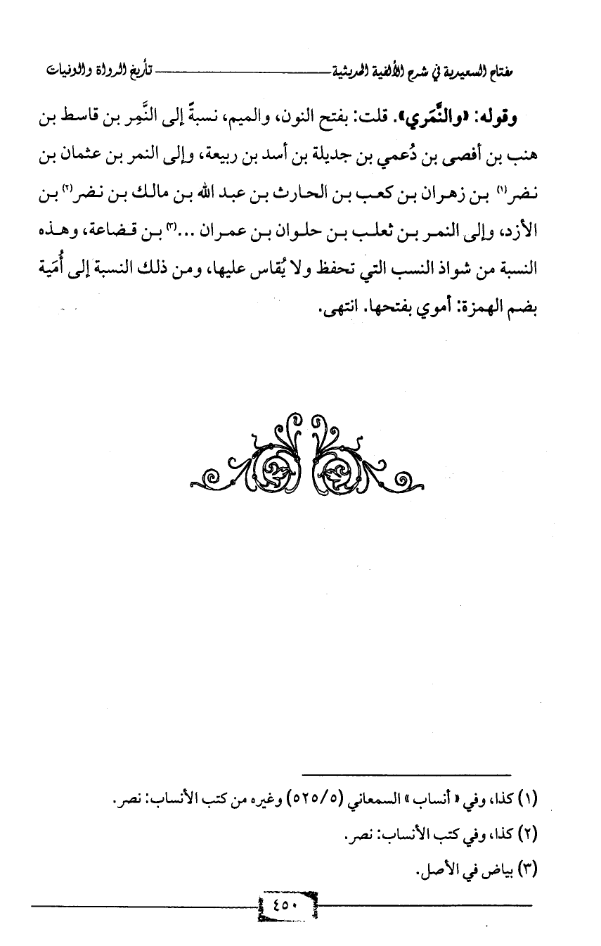 وقوله: «والنَّمَري». قلت: بفتح النون، والميم، نسبةً إلى النَّمِر بن قاسط بن هنب بن أفصى بن دُعمي بن جديلة بن أسد بن ربيعة، وإلى النمر بن عثمان بن نضر (¬1) بن زهران بن كعب بن الحارث بن عبد الله بن مالك بن نضر (¬2) بن الأزد، وإلى النمر بن ثعلب بن حلوان بن عمران ... (¬3) بن قضاعة، وهذه النسبة من شواذ النسب التي تحفظ ولا يُقاس عليها، ومن ذلك النسبة إلى أُمَية بضم الهمزة: أموي بفتحها. انتهى.
