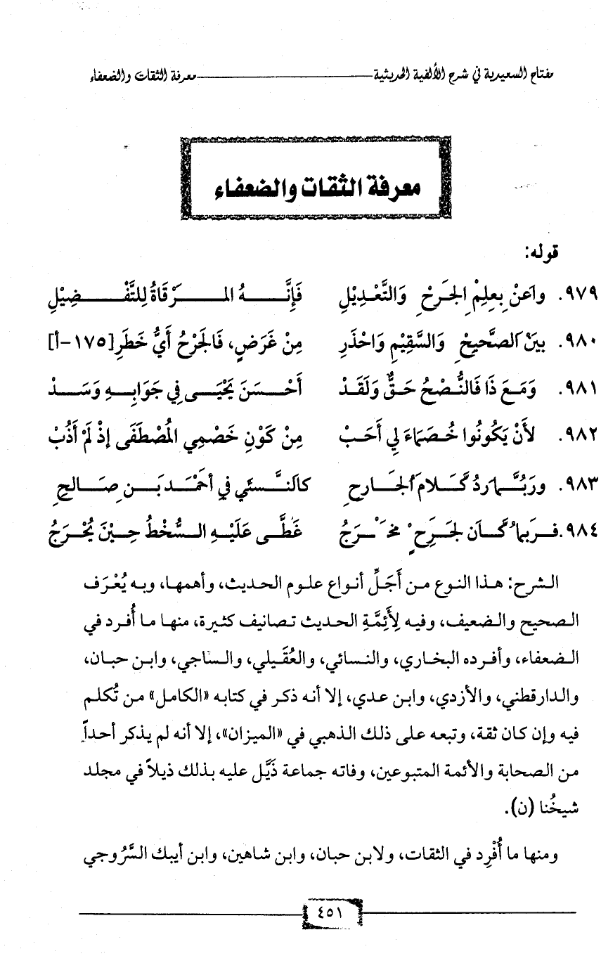 الشرح: هذا النوع من أَجَلِّ أنواع علوم الحديث، وأهمها، وبه يُعْرَف الصحيح والضعيف، وفيه لِأَئِمَّةِ الحديث تصانيف كثيرة، منها ما أُفرد في الضعفاء، وأفرده البخاري، والنسائي، والعُقَيلي، والساجي، وابن حبان، والدارقطني، والأزدي، وابن عدي، إلا أنه ذكر في كتابه «الكامل» من تُكلم فيه وإن كان ثقة، وتبعه على ذلك الذهبي في «الميزان»، إلا أنه لم يذكر أحداً من الصحابة والأئمة المتبوعين، وفاته جماعة ذَيَّل عليه بذلك ذيلاً في مجلد شيخُنا (ن).