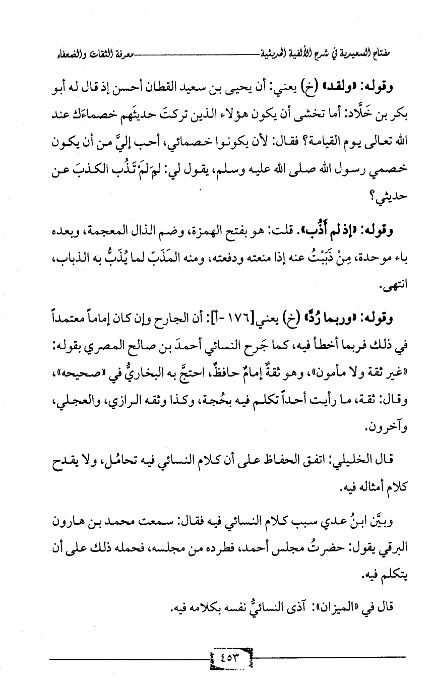 وقوله: «وربما رُدَّ» (خ) يعني [176 - أ]: أن الجارح وإن كان إماماً معتمداً في ذلك فربما أخطأ فيه، كما جَرح النسائي أحمدَ بن صالح المصري بقوله: «غير ثقة ولا مأمون»، وهو ثقةٌ إمامٌ حافظٌ، احتجَّ به البخاريُّ في «صحيحه»، وقال: ثقة، ما رأيت أحداً تكلم فيه بحُجة، وكذا وثقه الرازي، والعجلي، وآخرون.