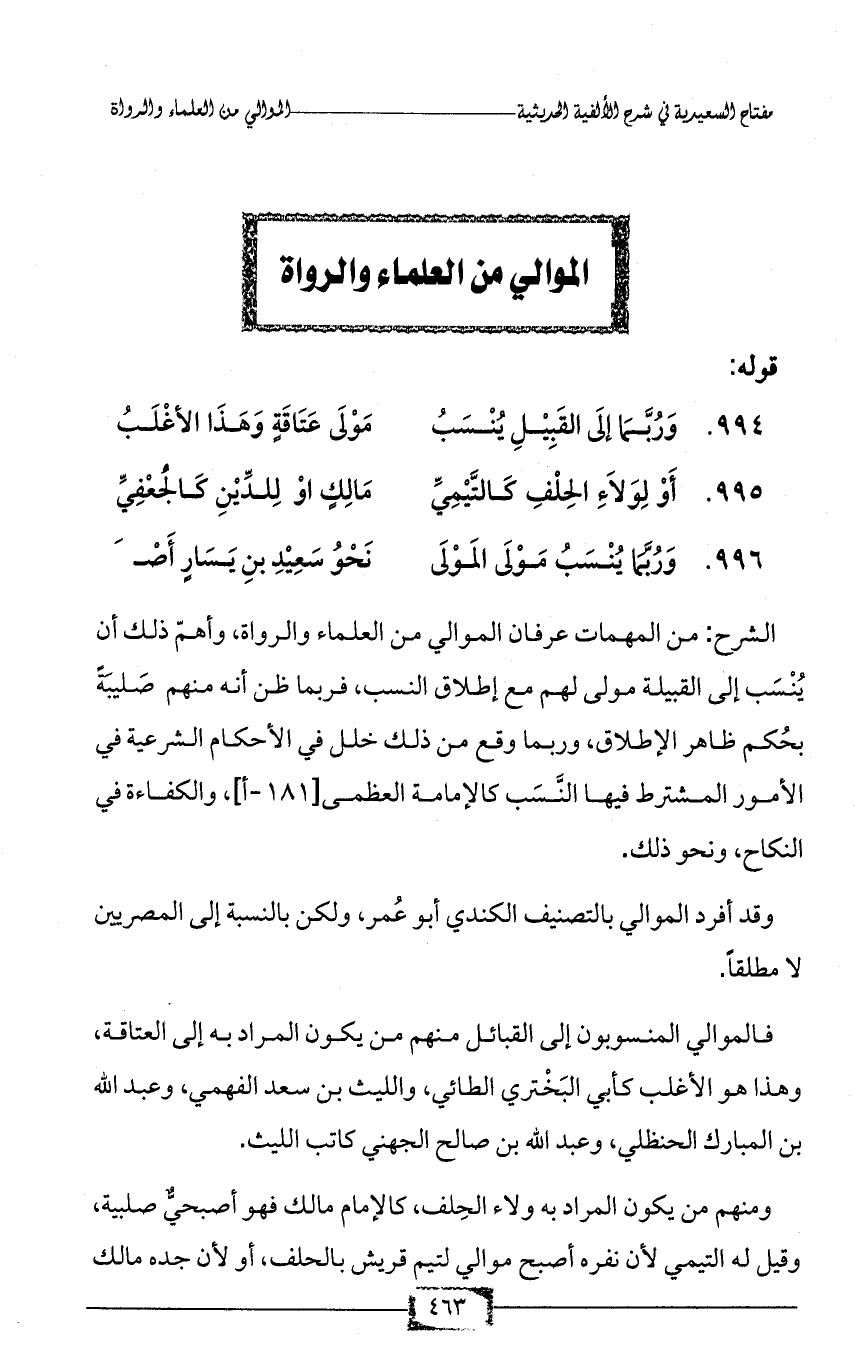 الشرح: من المهمات عرفان الموالي من العلماء والرواة، وأهمّ ذلك أن يُنْسَب إلى القبيلة مولى لهم مع إطلاق النسب، فربما ظن أنه منهم صَليبَةً بحُكم ظاهر الإطلاق، وربما وقع من ذلك خلل في الأحكام الشرعية في الأمور المشترط فيها النَّسَب كالإمامة العظمى [181 - أ]، والكفاءة في النكاح، ونحو ذلك.