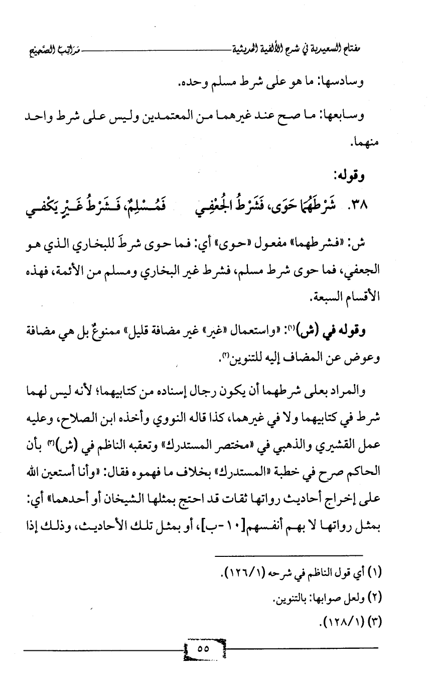 38 - شَرْطَهُمَا حَوَى، فَشَرْطُ الجُعْفِي ... فَمُسْلِمٌ، فَشَرْطُ غَيْرٍ يَكْفي