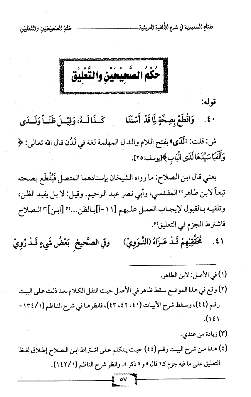 (¬4) هذا من شرح البيت رقم (44) حيث يتكلم على اشتراط ابن الصلاح إطلاق لفظ التعليق على ما فيه جزم كـ «قال» و «ذكر». وانظر شرح الناظم (1/ 142).