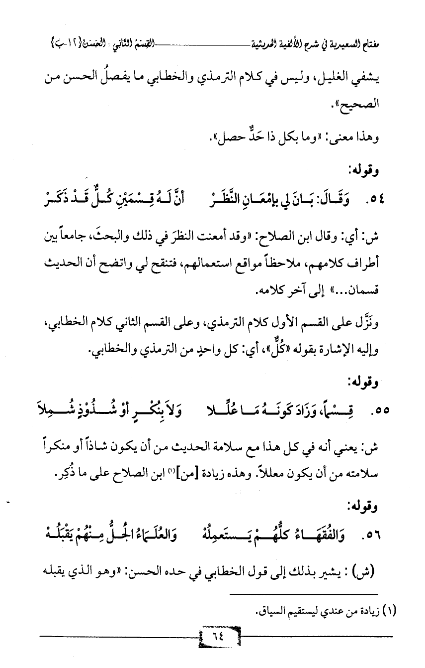 56 - وَالفُقَهَاءُ كلُّهُمْ يَستَعمِلُهْ ... وَالعُلَمَاءُ الْجُلُّ مِنْهُمْ يَقْبَلُهْ