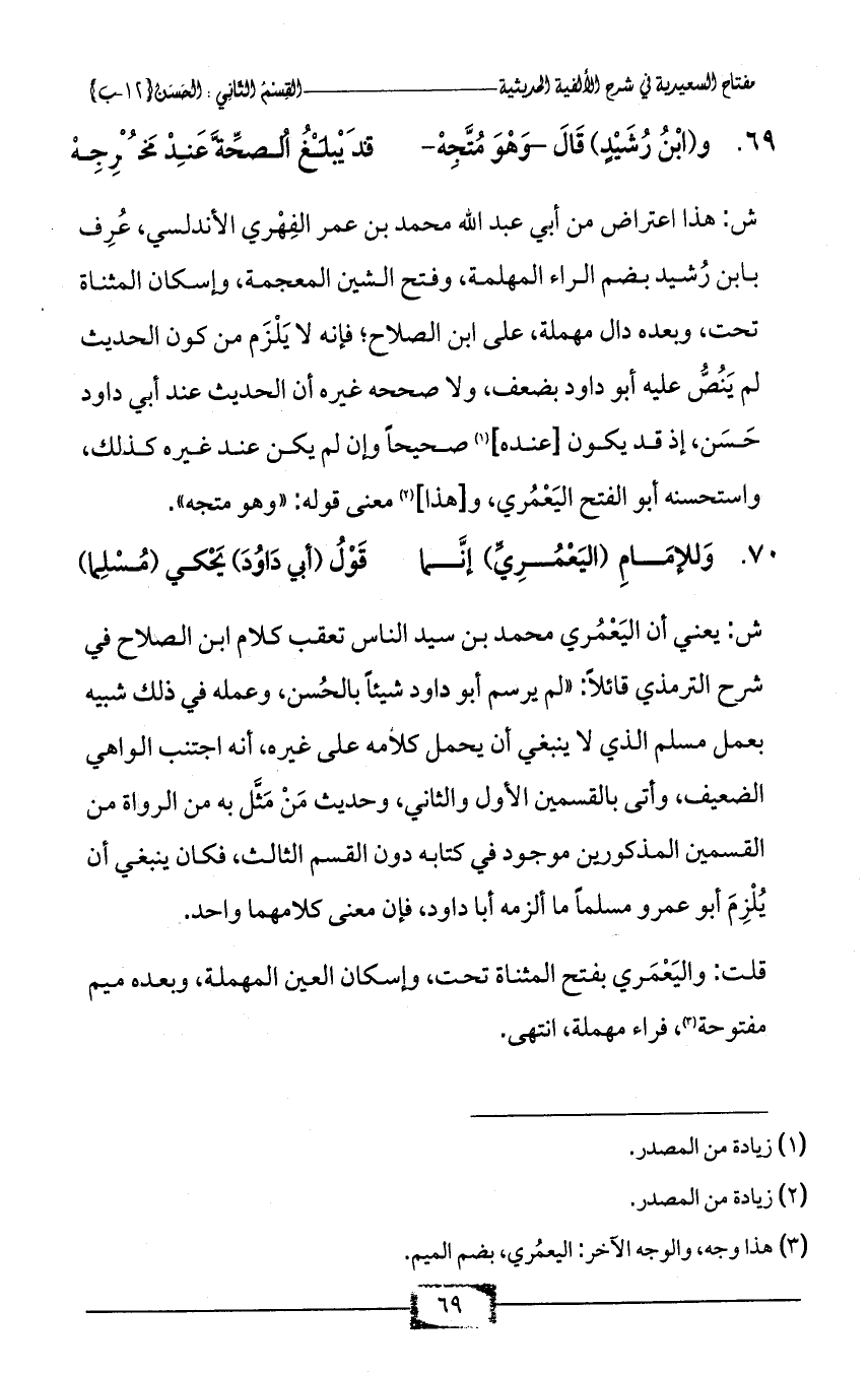ش: يعني أن اليَعْمُري محمد بن سيد الناس تعقب كلام ابن الصلاح في شرح الترمذي قائلاً: «لم يرسم أبو داود شيئاً بالحُسن، وعمله في ذلك شبيه بعمل مسلم الذي لا ينبغي أن يحمل كلامه على غيره، أنه اجتنب الواهي الضعيف، وأتى بالقسمين الأول والثاني، وحديث مَنْ مَثَّل به من الرواة من القسمين المذكورين موجود في كتابه دون القسم الثالث، فكان ينبغي أن يُلْزِمَ أبو عمرو مسلماً ما ألزمه أبا داود، فإن معنى كلامهما واحد.