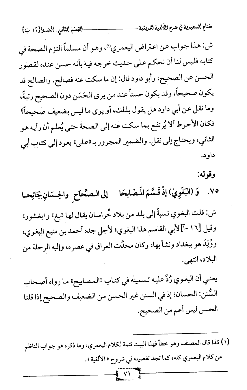 75 - وَ (البَغَوِيْ) إذْ قَسَّمَ المَصْابحَا ... إلى الصِّحَاحِ والحِسَانِ جَانِحا