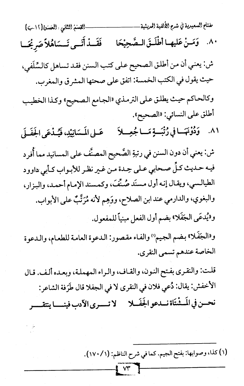 81 - وَدُوْنَهَا في رُتْبَةٍ مَا جُعِلاَ ... عَلى المَسَانِيْدِ، فَيُدْعَى الجَفَلَى