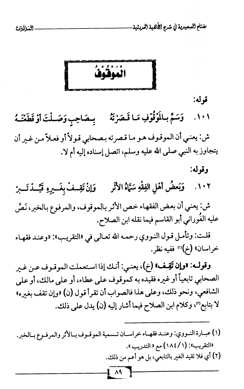 ش: يعني أن الموقوف هو ما قصرته بصحابي قولاً أو فعلاً من غير أن يتجاوز به النبي صلى الله عليه وسلم، اتصل إسناده إليه أم لا.