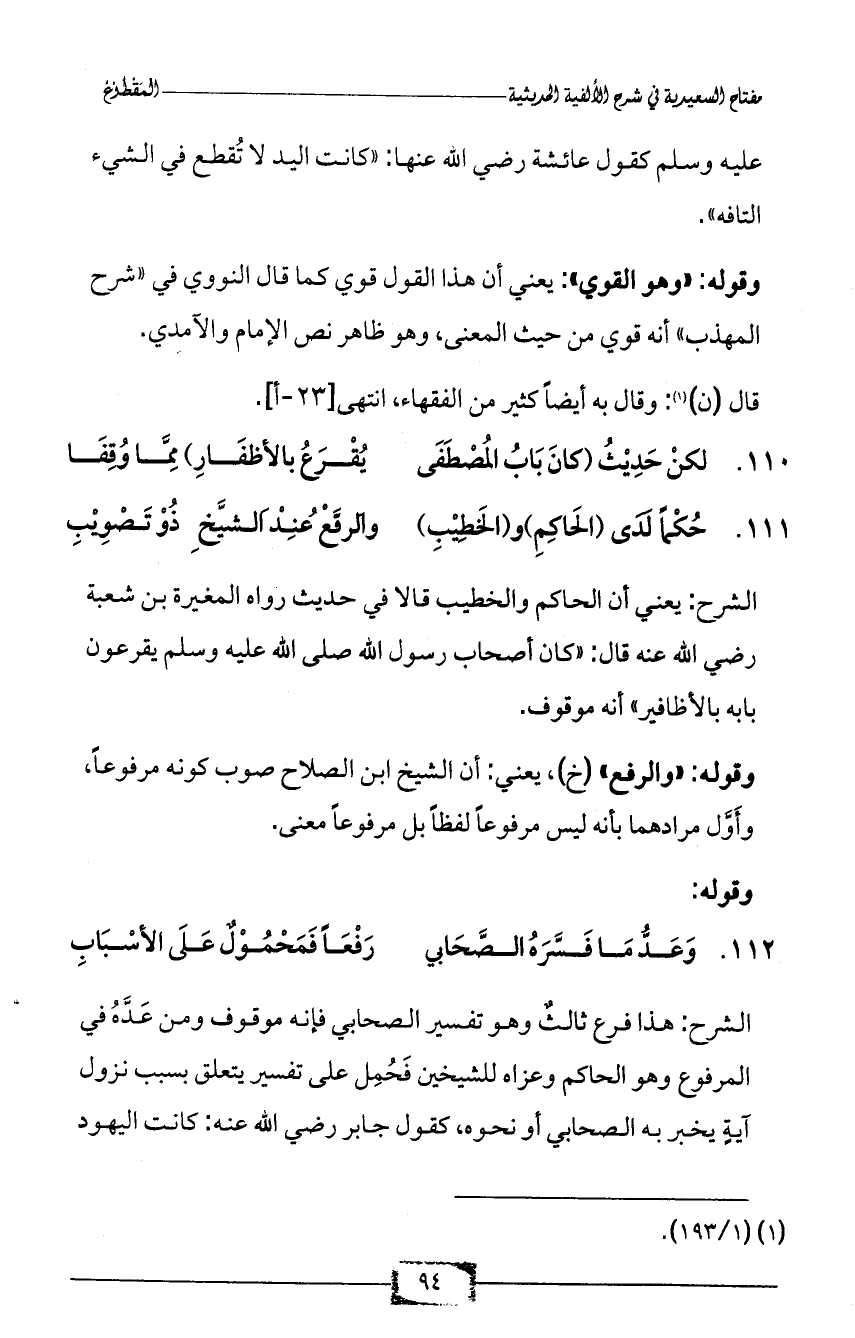 112 - وَعَدُّ مَا فَسَّرَهُ الصَّحَابي ... رَفْعَاً فَمَحْمُوْلٌ عَلَى الأسْبَاب
