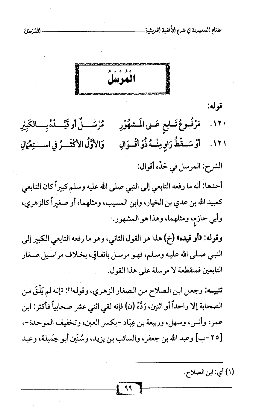 وقوله: «أو قيده» (خ) هذا هو القول الثاني، وهو ما رفعه التابعي الكبير إلى النبي صلى الله عليه وسلم، فهو مرسل باتفاقٍ، بخلاف مراسيل صغار التابعين فمنقطعة لا مرسلة على هذا القول.
