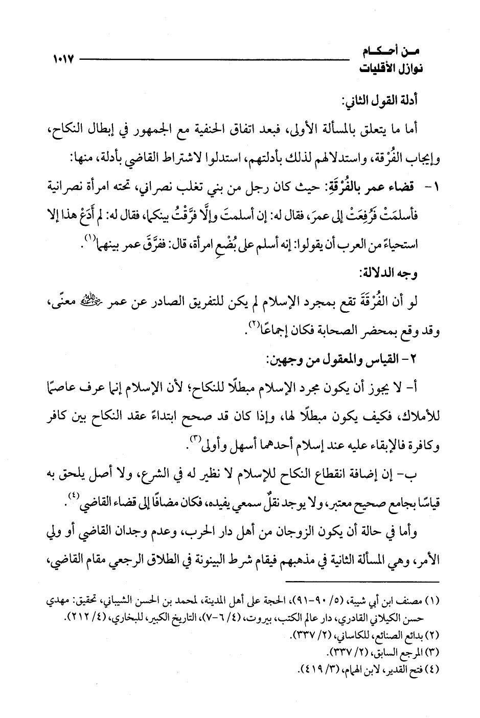 ب - إن إضافة انقطاع النكاح للإسلام لا نظير له في الشرع، ولا أصل يلحق به قياسًا بجامع صحيح معتبر، ولا يوجد نقلٌ سمعي يفيده، فكان مضافًا إلى قضاء القاضي (¬4).