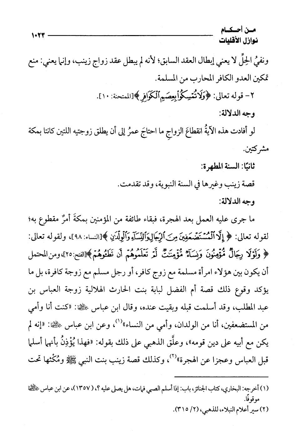 ما جرى عليه العمل بعد الهجرة، فبقاء طائفة من المؤمنين بمكةَ أمرٌ مقطوع به؛ لقوله تعالى: {إِلَّا الْمُسْتَضْعَفِينَ مِنَ الرِّجَالِ وَالنِّسَاءِ وَالْوِلْدَانِ} [النساء: 98]، ولقوله تعالى: {وَلَوْلَا رِجَالٌ مُؤْمِنُونَ وَنِسَاءٌ مُؤْمِنَاتٌ لَمْ تَعْلَمُوهُمْ أَنْ تَطَئُوهُمْ} [الفتح: 25]، ومن المحتمل أن يكون بين هؤلاء امرأة مسلمة مع زوج كافر، أو رجل مسلم مع زوجة كافرة، بل ما يؤكد وقوع ذلك قصة أم الفضل لبابة بنت الحارث الهلالية زوجة العباس بن عبد المطلب، وقد أسلمت قبله وبقيت عنده، وقال ابن عباس -رضي الله عنهما-: "كنت أنا وأمي من المستضعفين، أنا من الولدان، وأمي من النساء" (¬1)، وعن ابن عباس -رضي الله عنهما-: "إنه لم يكن مع أبيه على دين قومه"، وعلَّق الذهبي على ذلك بقوله: "فهذا يُؤْذِنُ بأنهما أسلما قبل العباس وعجزا عن الهجرة" (¬2)، وكذلك قصة زينب بنت النبي - صلى الله عليه وسلم - ومُكْثها تحت